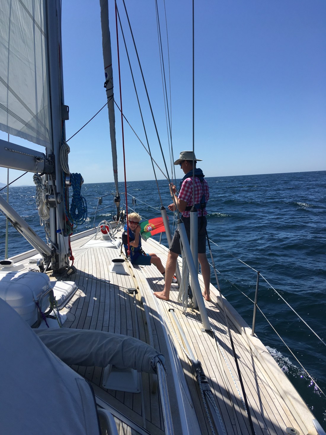 1400 nautical miles into our adventure and we’ve made it to Portugal. With a strong northern breeze behind us we pushed on to PĂłvoa de Varzim (just north of Porto) and Hugo excitedly raised our Portuguese courtesy flag. We sailed near a Dutch boat who kindly took some photos of us sailing as we passed them. The Portuguese coastline looks so developed compared with Spain and our first experience of a Portuguese town is that it is much wealthier. Albeit that prices are cheap, we’ve eaten out as a family of four, stuffed ourselves, over ordered on dishes and still got change from €30! This is my type of place! We’ve arrived in time for a colourful ‘romaria’ tomorrow and the preparations today have included a LOT of fireworks, mostly let off during daylight and mainly about the noise they make. The speakers are being tested currently at 11pm and the dancing and singing has started already. Even the church appears to be getting a set of Christmas lights. Tomorrow should be fun…