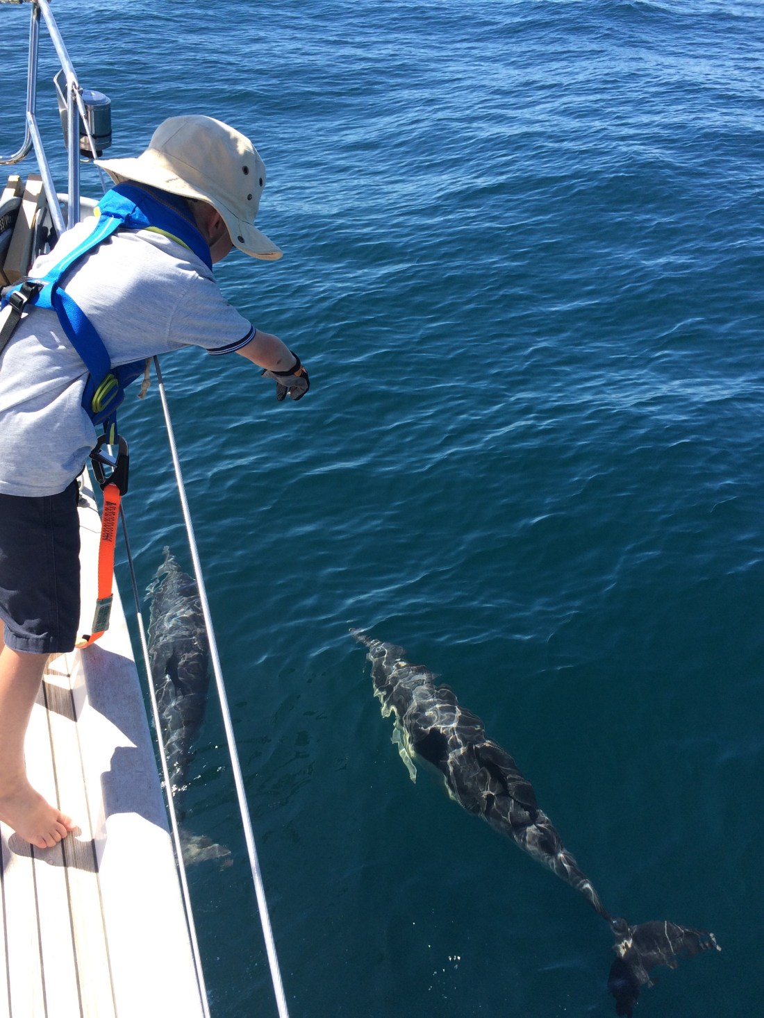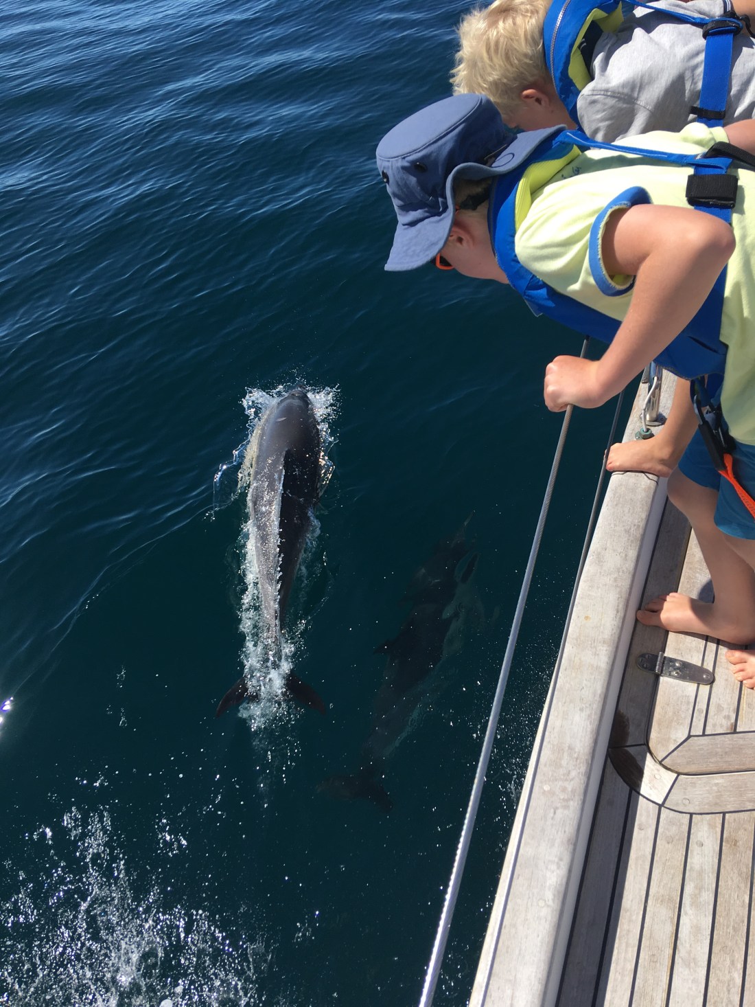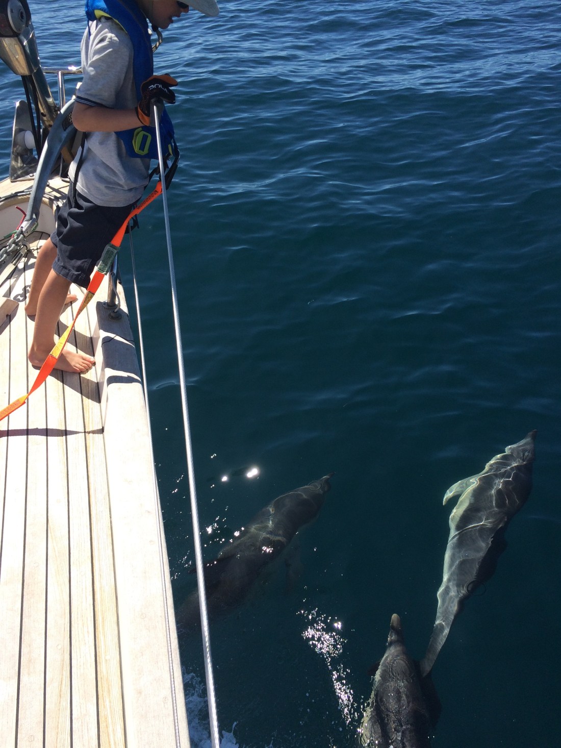 Whilst sailing to and from Porto (or rather Leixões) we were joined by a playful pod of dolphins who jumped and swam with us for over an hour. They liked the 8kts we were cruising at and stayed playing in our bow wave, keeping us enthralled. The water was so crystal clear you could see them swim and take turns surfing and spinning in the waves, both above and below. Hugo’s comment to me captured why we were doing this trip when he said, “mummy who needs to watch Blue Planet when you can see this!” Felix insists he is fluent in ‘dolphin’ with his excited squeaks and popping noises too. With Chloe onboard the dolphins swam with us every day and we were even treated to a mother and baby dolphin too, together with a large pod of seven or more dolphins, it was truly magical.