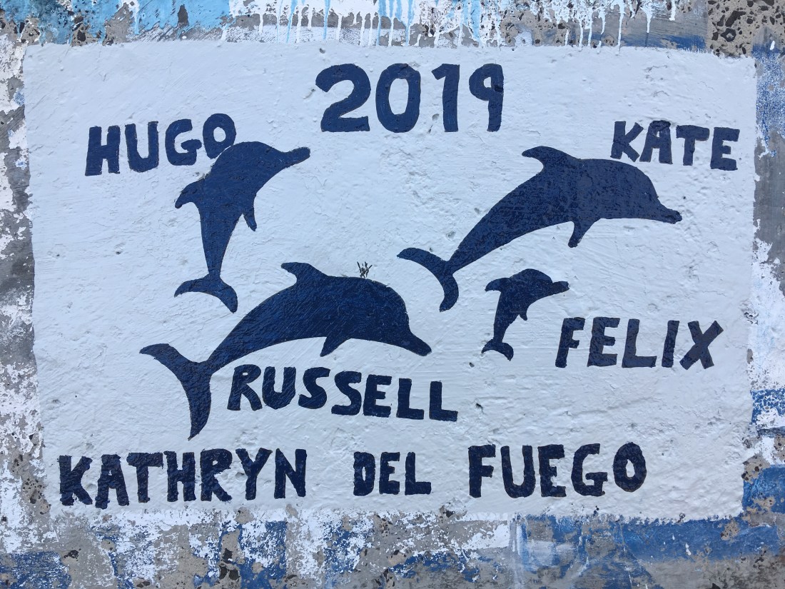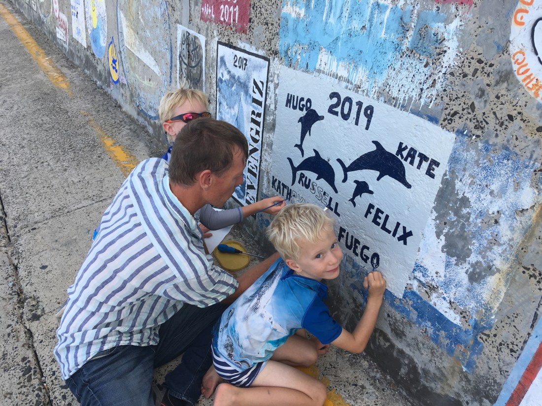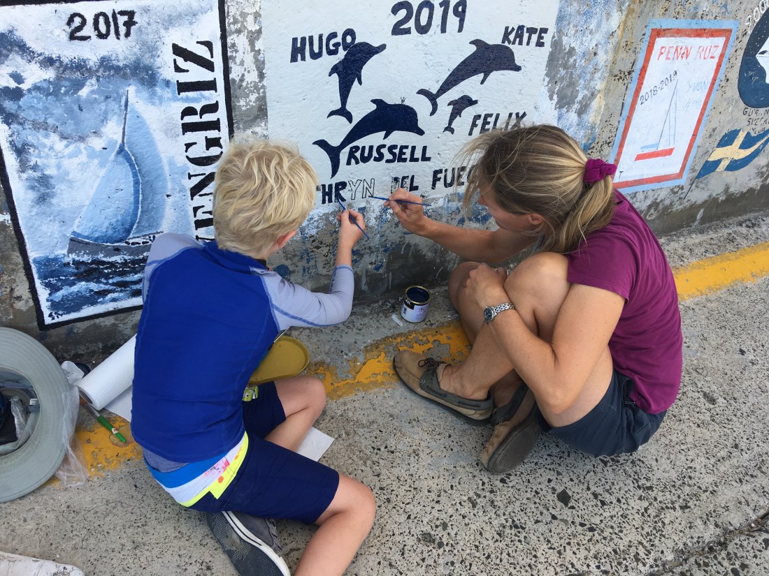 Porto Santo’s harbour has a tradition for visiting yachts to paint the sea wall with their emblem or house flag. Russell last sailed here in 1994 and we managed to find his previous yacht painting albeit somewhat faded now. So we set too to paint our flag for this trip/yacht. Everyone had a go at painting (yes with oil paints 😳, what can go wrong with a five year old??). If you are visiting do look out for it! (The dinghy was kept well out of reach this time! 😂) Being on the seawall was a bit like that scene in ‘Local Hero’ where a random scooter/bike/car goes speeding past every 5 mins. There is nowhere to go on the seawall!