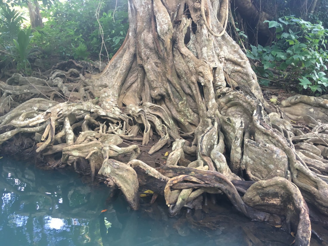 Dramatic roots dangle over the river as you meander slowly up another setting from the Pirates of the Caribbean film in Dominica.