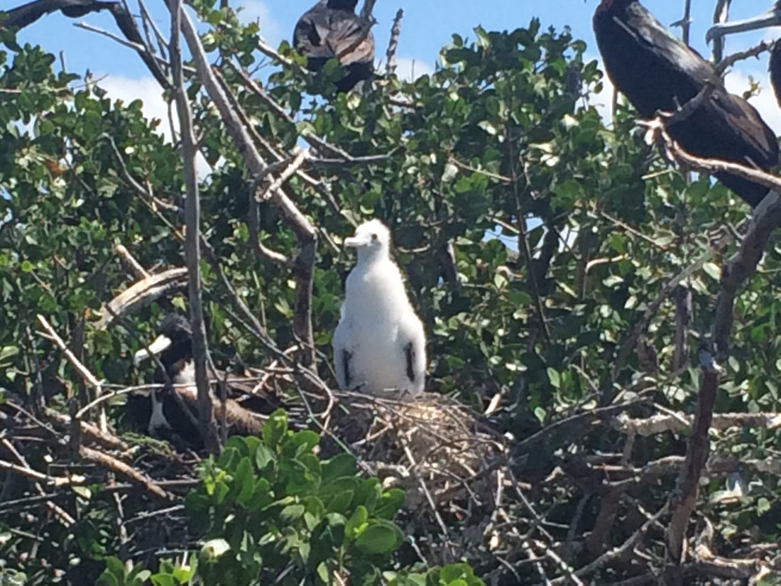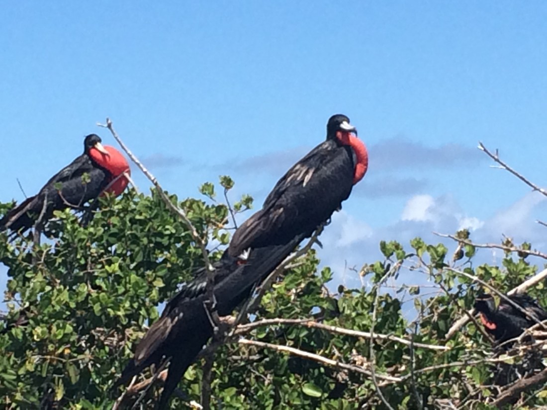 Inside the beach lies a large sea water lagoon where an amazing colony of great frigate birds live. It was great to see them, puffed up red chests together with their fluffy white young chicks.
