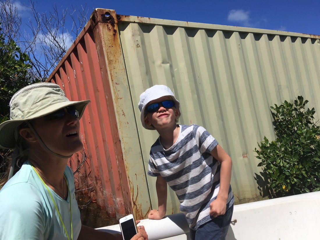 The devastation caused by the hurricane last year on Barbuda was total. The container that Felix is looking in the photo below was picked up by the wind from the airport four miles away and dumped in the lagoon – it’s full of engines/transformers (not exactly lightweight).