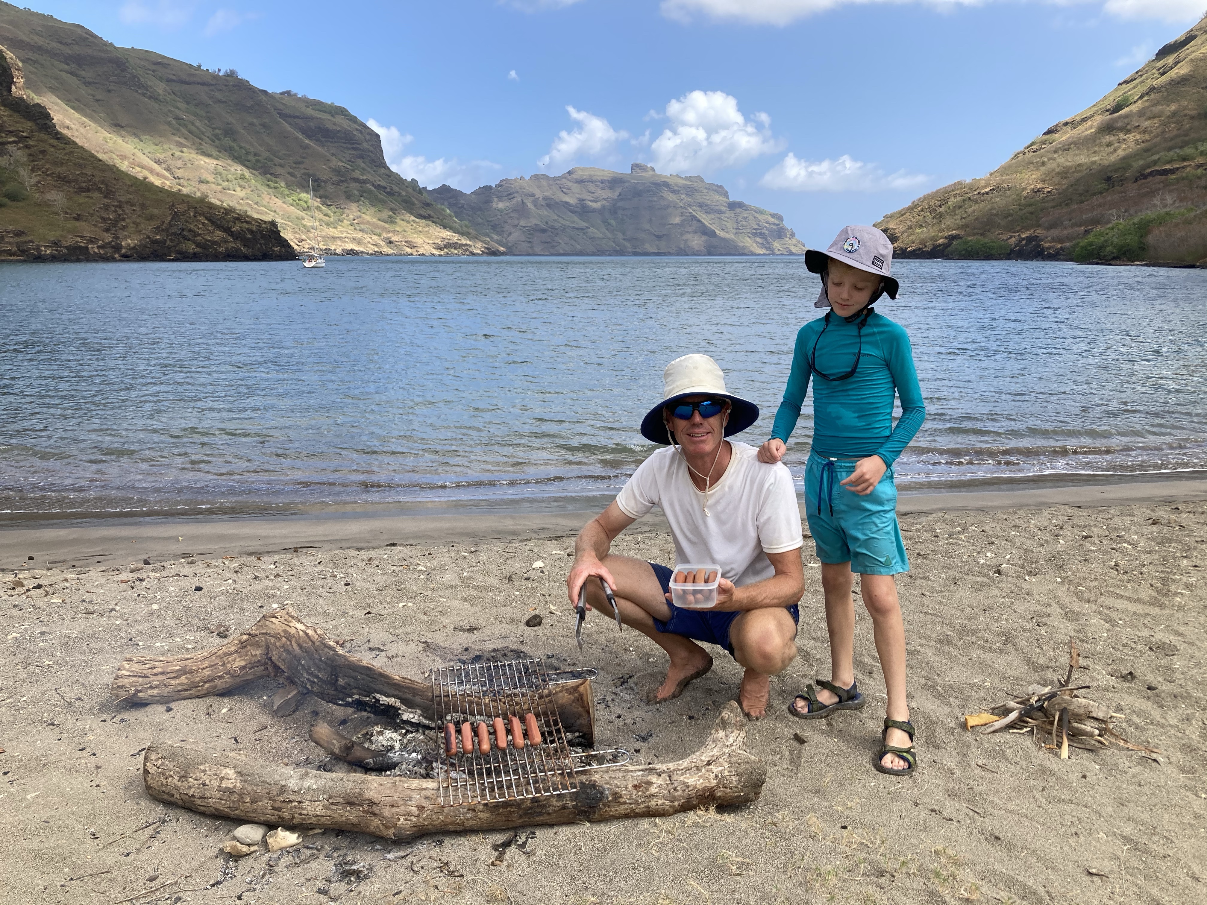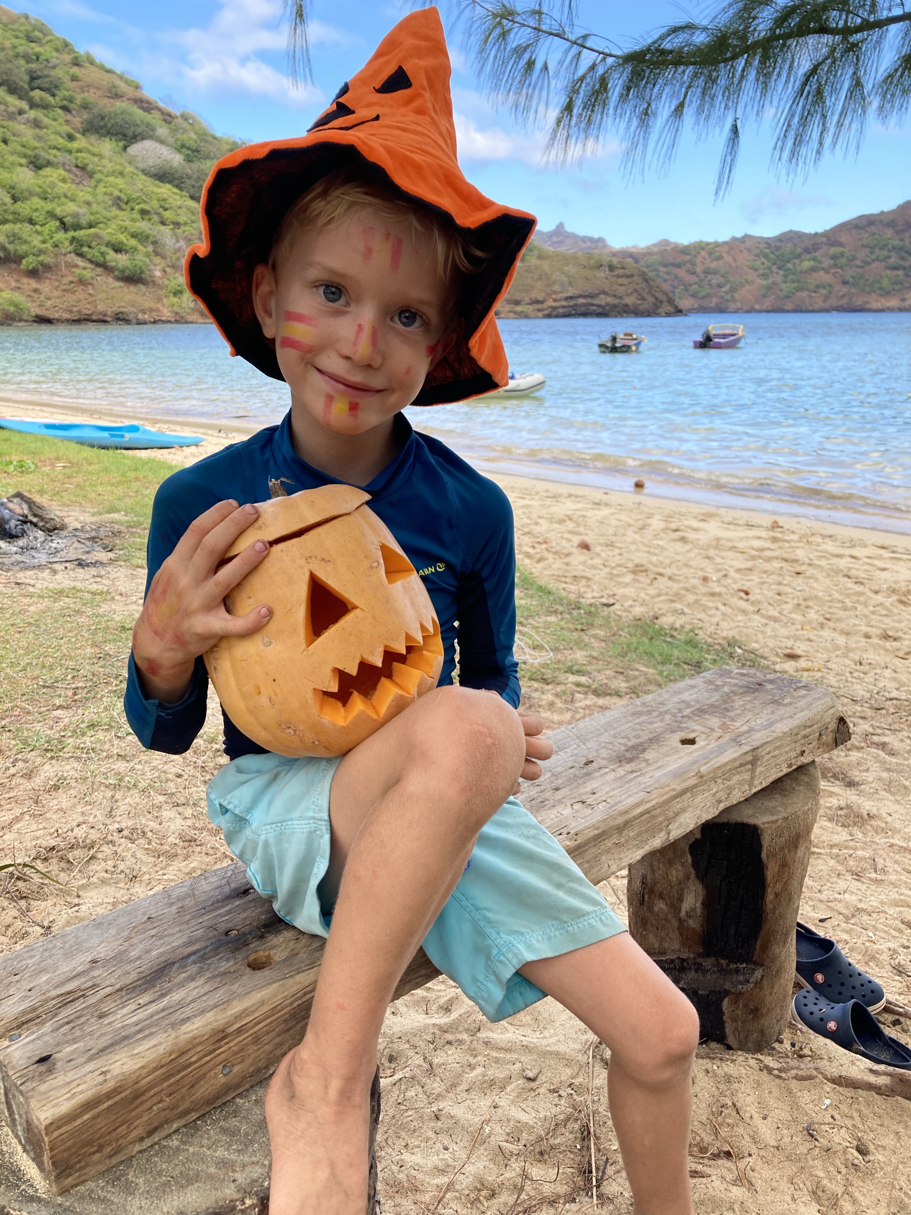 For Felix’s birthday on Halloween we found a gorgeous anchorage in Anaho and finally met some other family cruising boats. Time to switch languages from Spanish to French. We had a great party on the beach with fancy dress, pumpkin (aka squash carving), bbq, bonfire and cake. Knowing Felix’s fixation with fire one of the Spanish mother’s kindly did a fire juggling circus show for him as the sun went down. It was breathtaking. As we took the dinghy back to the boat afterwards Felix said, “it was the best birthday ever”. Perfect!