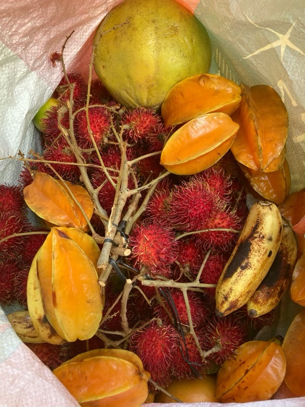We bought mangoes, ranbutan, and pamplemousse from roadside stalls and ate bananas, star fruit and coconuts from the trees we passed.