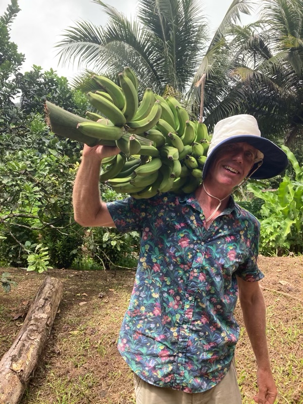Later we spotted André paddling his battered outrigger and fishing in the river head near our anchored yacht. We quickly sorted out some spare fishing gear and paddled over to give it to him. Delighted, he promptly gave us fish – still alive. We are not going to go hungry in this valley!
