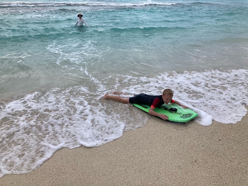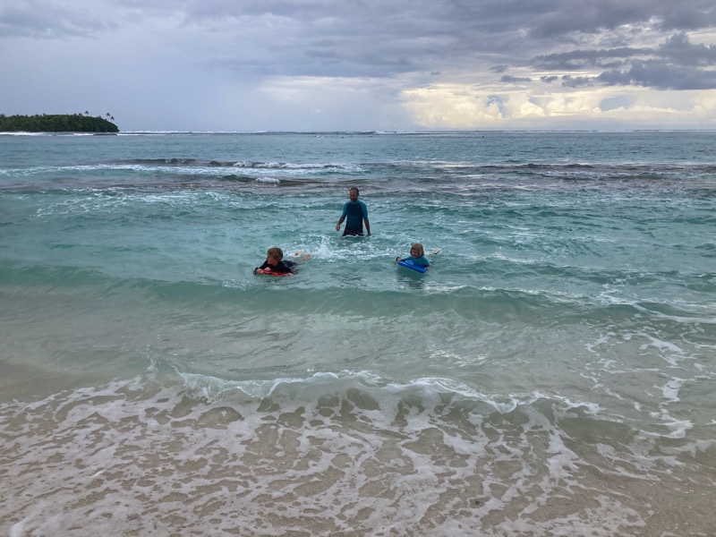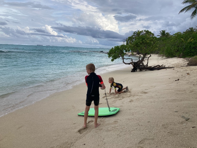 We took the dinghy round the headland and let the children enjoy boogie boarding on the small inner waves. The outer waves are for the professionals only, unless you like crashing into shallow coral!