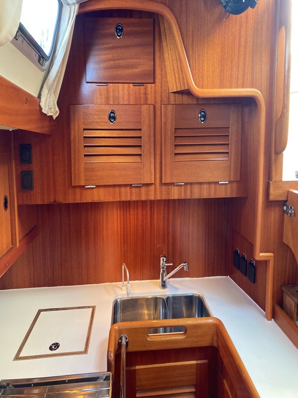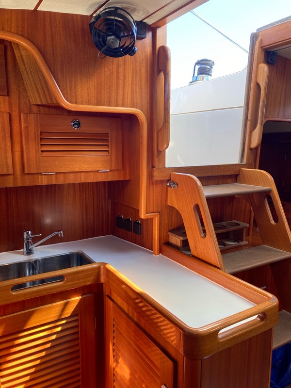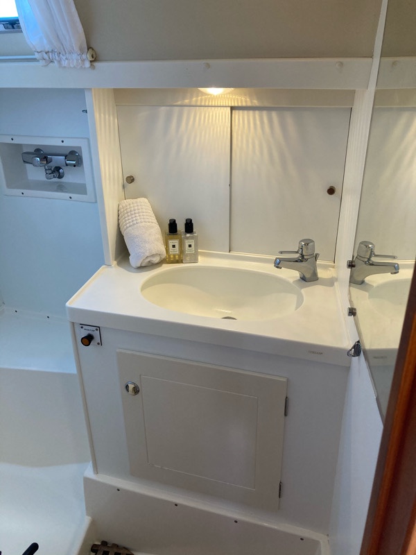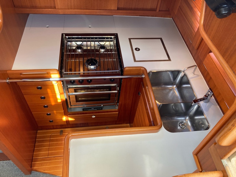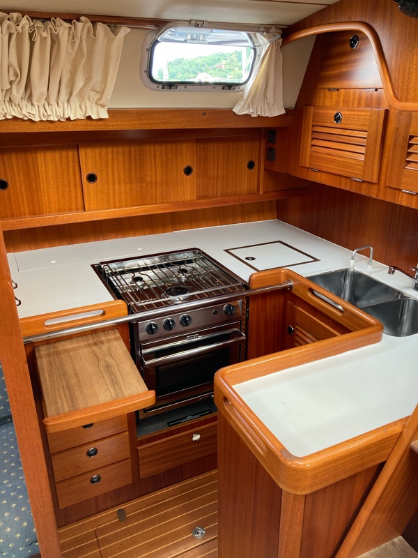 The galley, the kitchen, is small and compact but great to cook in whilst sailing when you need to wedge yourself in to hold pans.