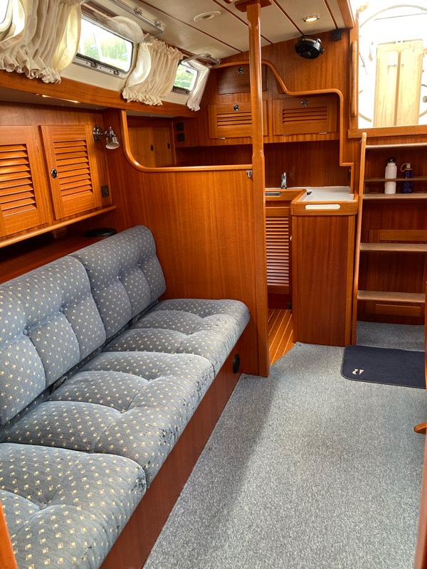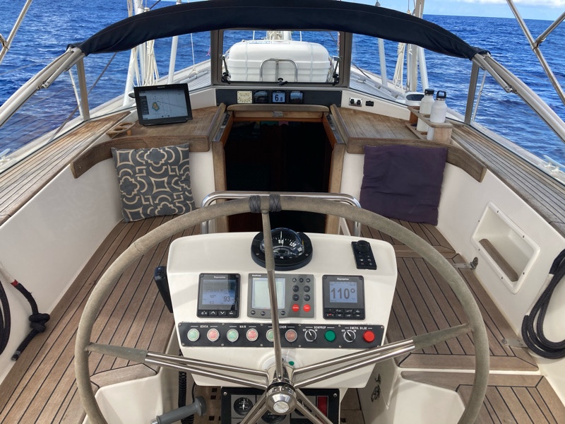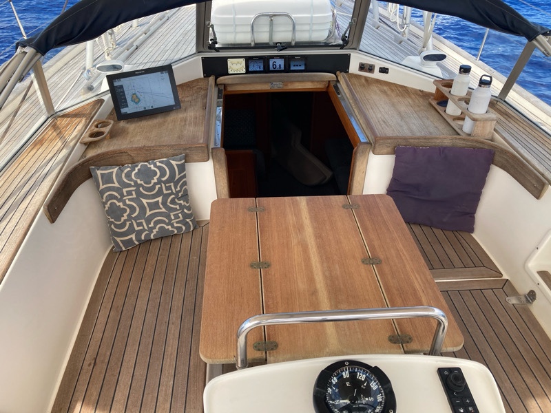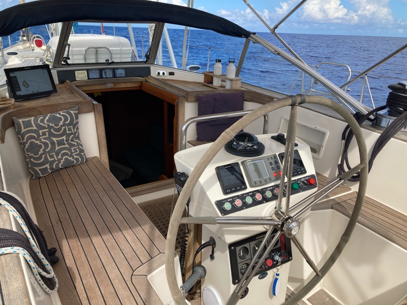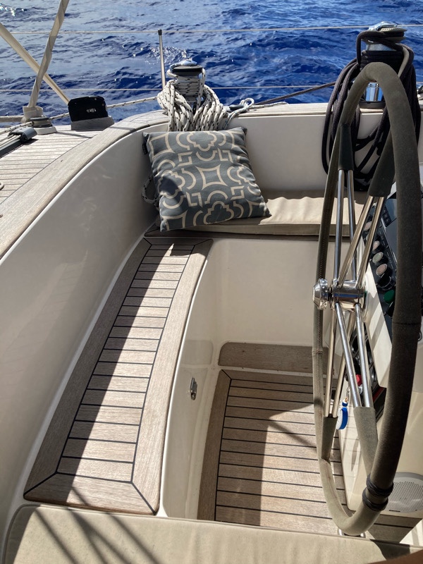 The outside where we live in the cockpit for eating, schooling and entertaining. Both a great sailing and party boat!