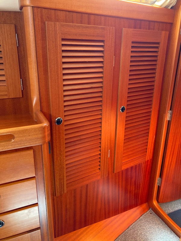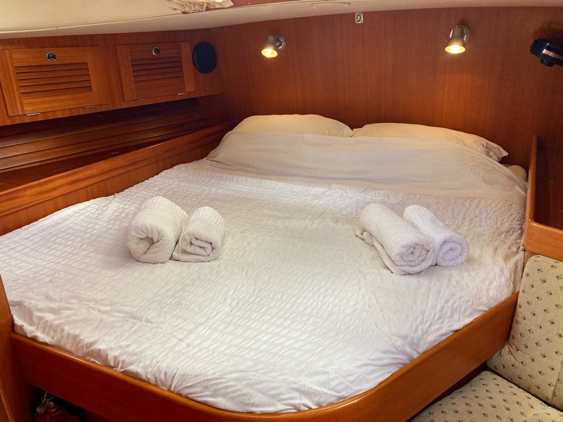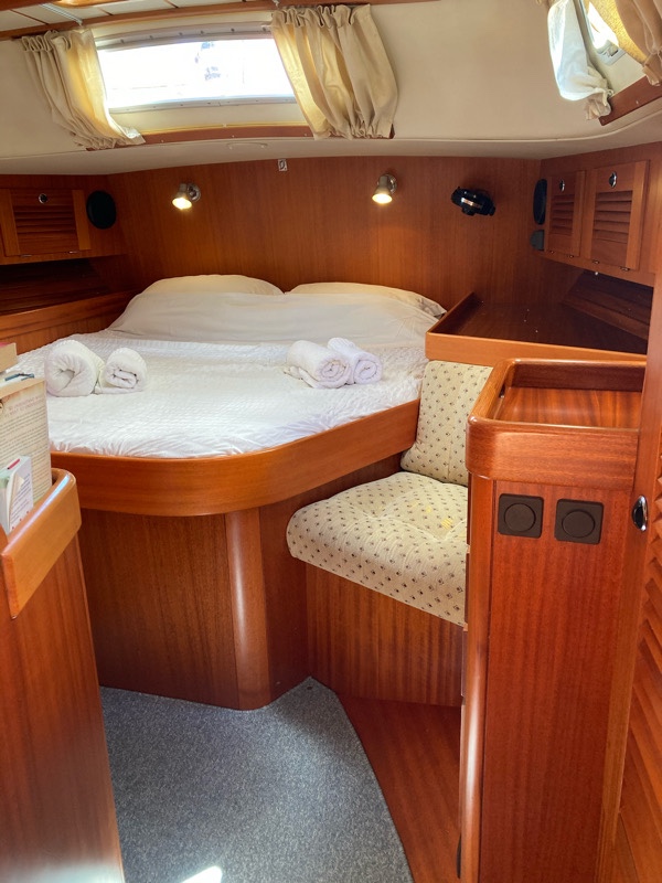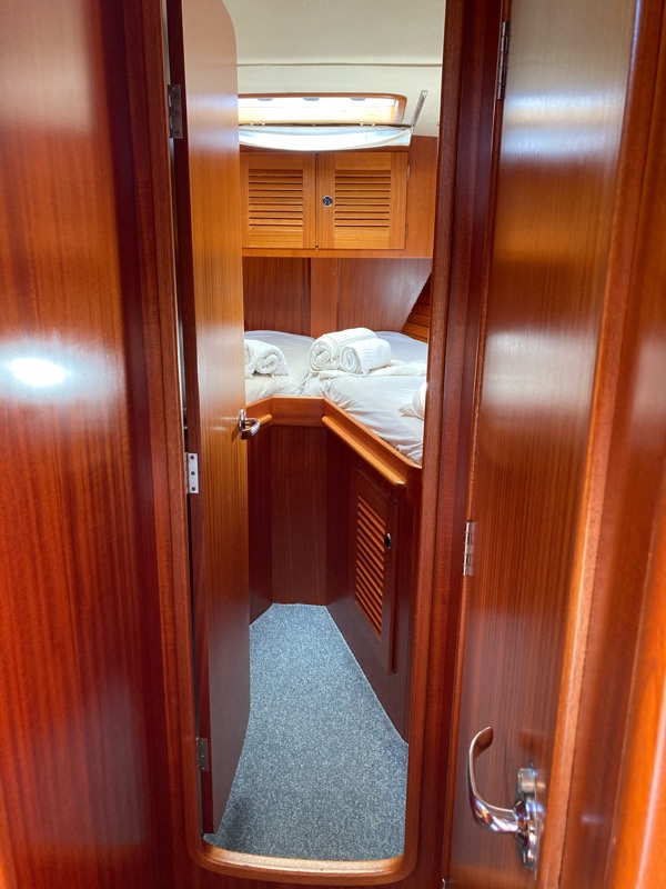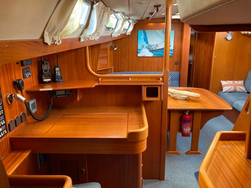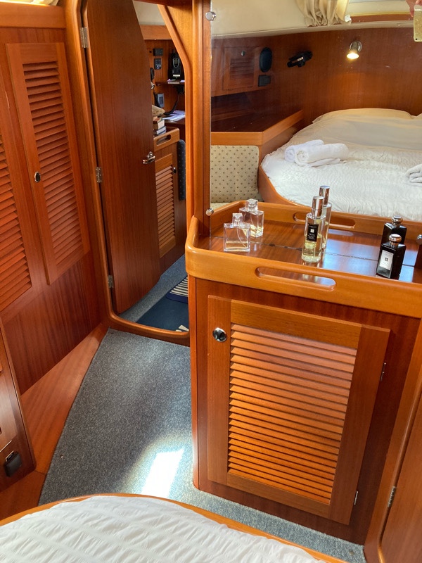 Behind the saloon is the chart table and through into the master cabin. The woodwork is outstanding – true craftsmanship went into building this yacht.
