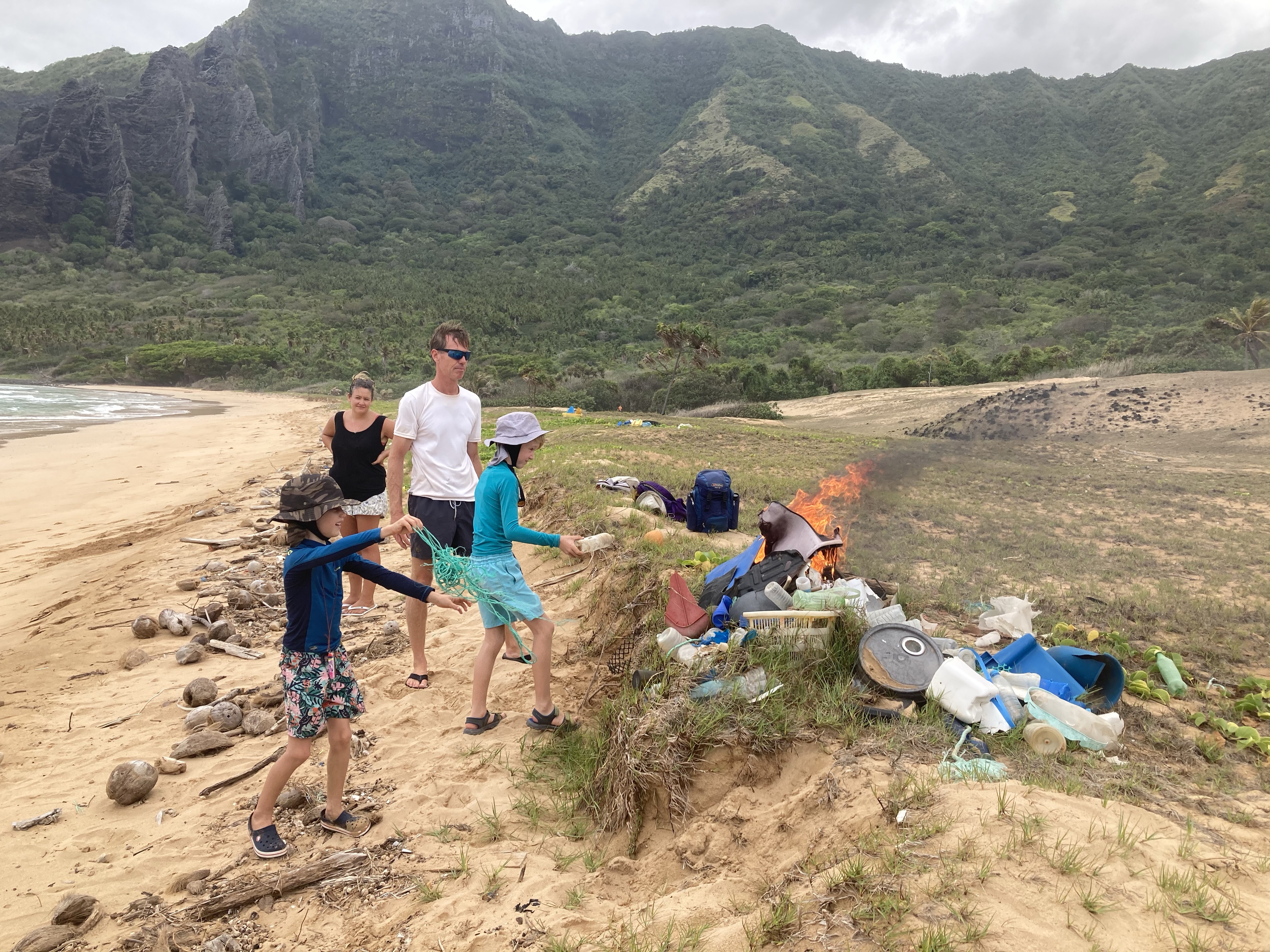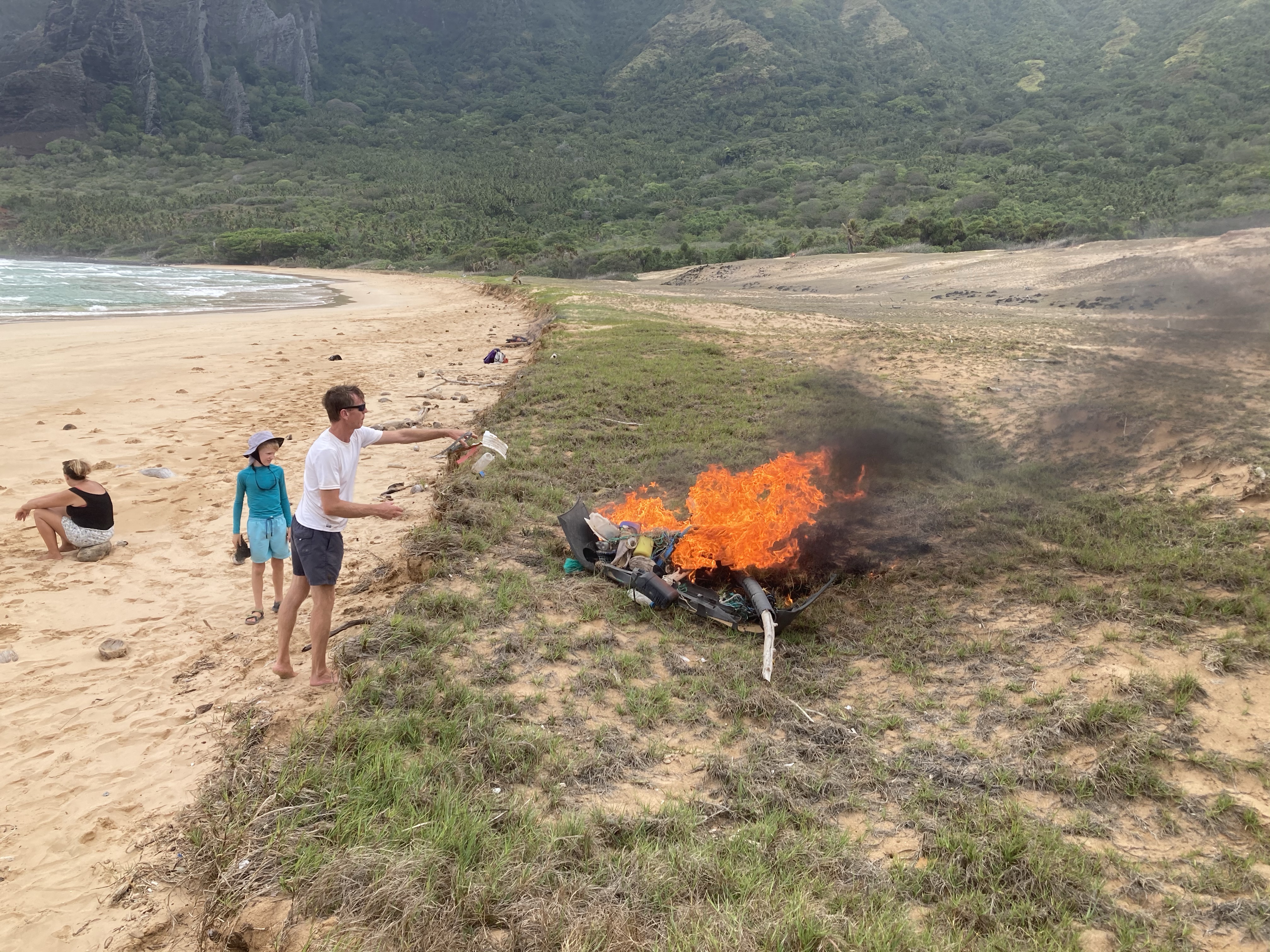 You name it everything plastic was there, bottles, lids, shoes, cutlery, fuel containers, rope, lots of items with Chinese packaging, even car parts and the list goes on. We started making bonfires to get rid of it all. We worked all day, back breaking work, demoralising (the sheer volume to clear up) and bug eaten!