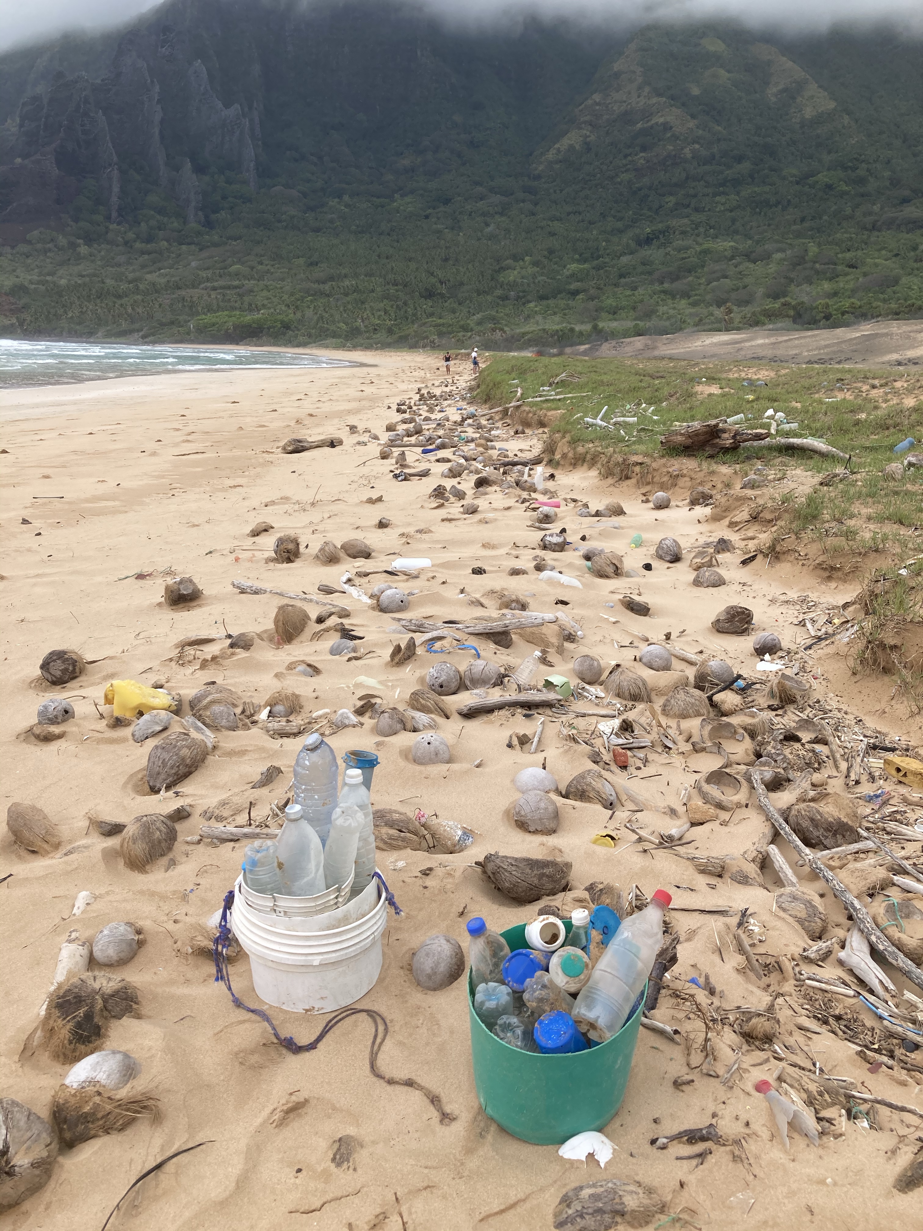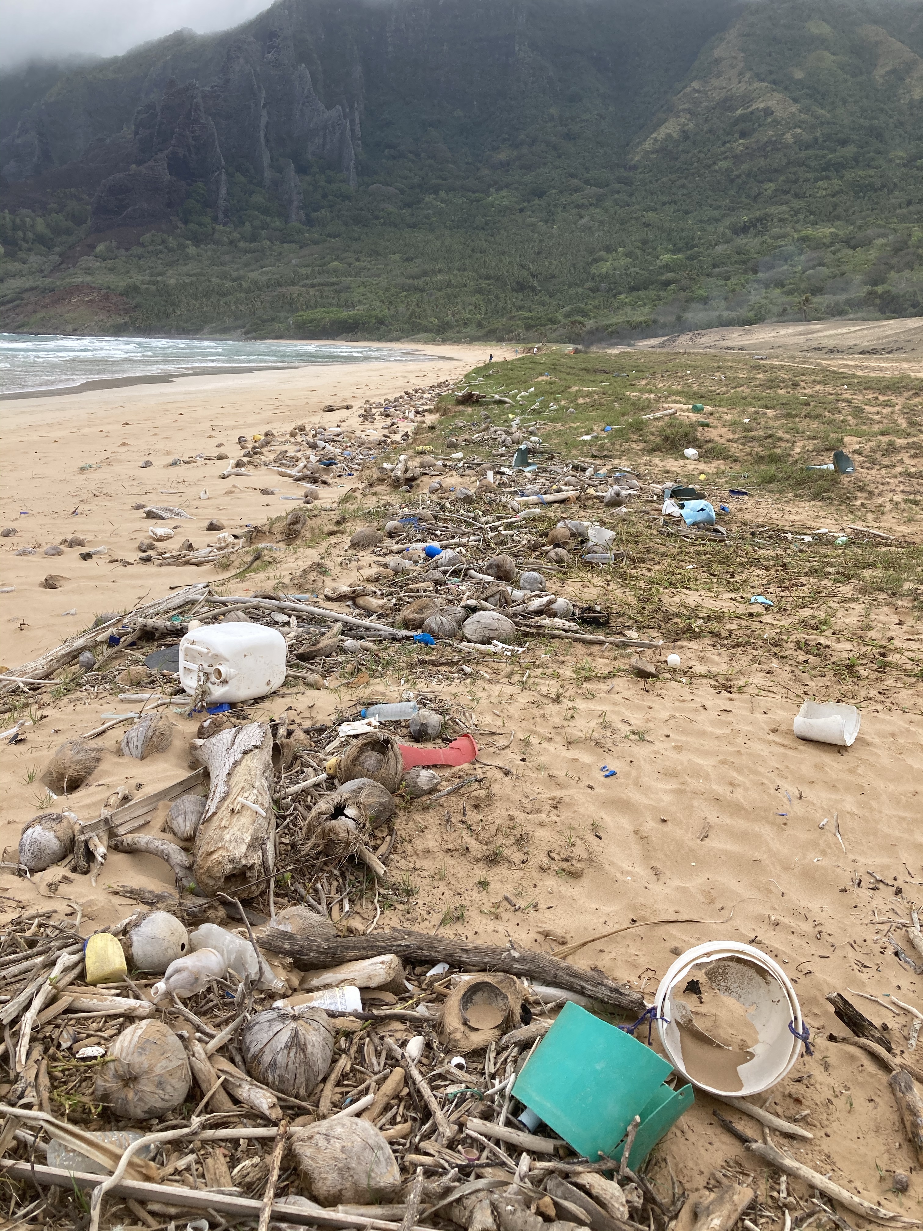 We decided to hike to the next bay and explore the large windward beach there. What we found to our dismay was a 500m+ long white beach which was awash with waste plastic.