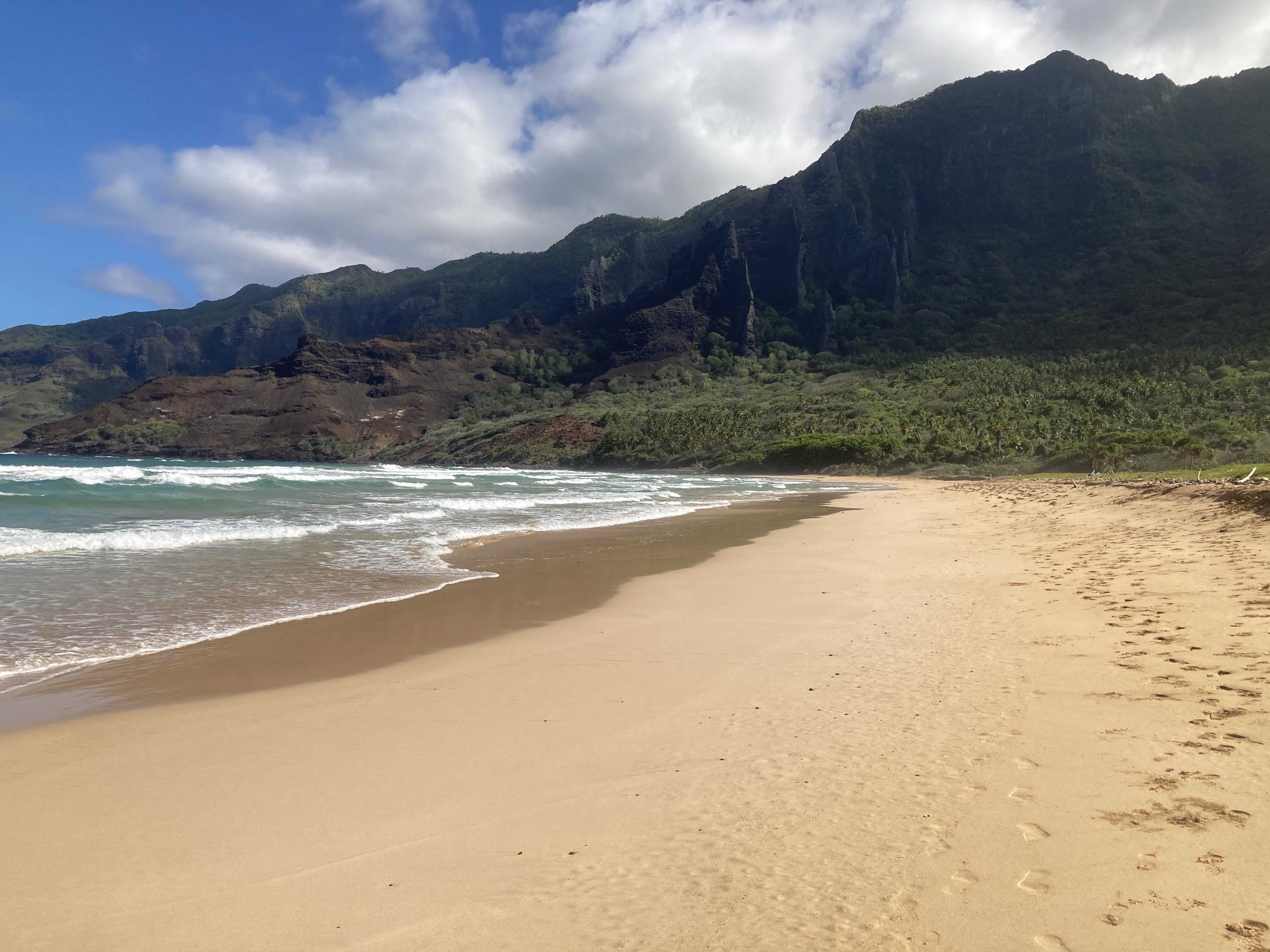 There are no roads or Infrastructure to the bay and there is a tiny hamlet of a local Polynesian village. No electricity or running water and certainly no WiFi or phone signal. In an hours hike along the stunning white beach and coconut backed coast and up into the next valley we can get to a small farm which sells home grown delicious local fruit and vegetables.