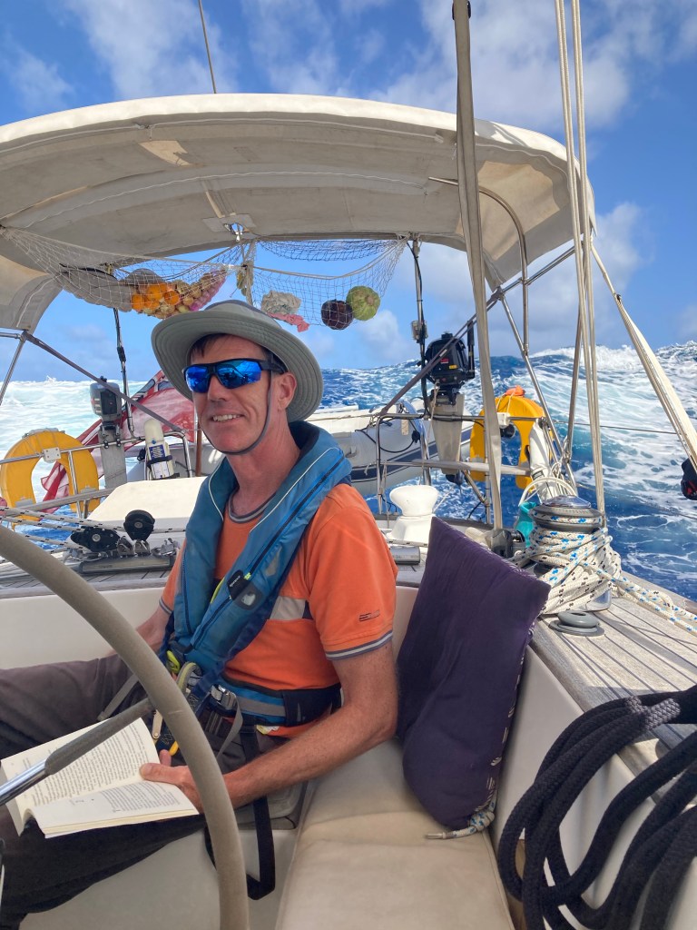 All the way we have celebrated mini milestones knocking off the next 100nm, getting to under 1000nm then 500nm and now we are at only 300nm to go, it’s unbelievable although also very ground hog day. The weather is sunny, the sky and sea are blue, the wind 25-35kts and the waves are still big and rolly with two sets hitting our stern at different angles, one typically 3.5m and the other set 2.5m, no prizes to guess that they then combine hence our constant motion. We also have a daily wager on what the water temperature has risen too. So far we are on 25.9 degrees which is a rise of 9 degrees since we left. Everyone seems to have had a turn at winning with Felix being particularly canny with accuracy. Looks like it will be perfect swimming temperature when we arrive. We’ve also celebrated sailing 11,000 nautical miles so far in the trip, not bad for a six and eight year old to have that sailing mileage under their belt at their ages.