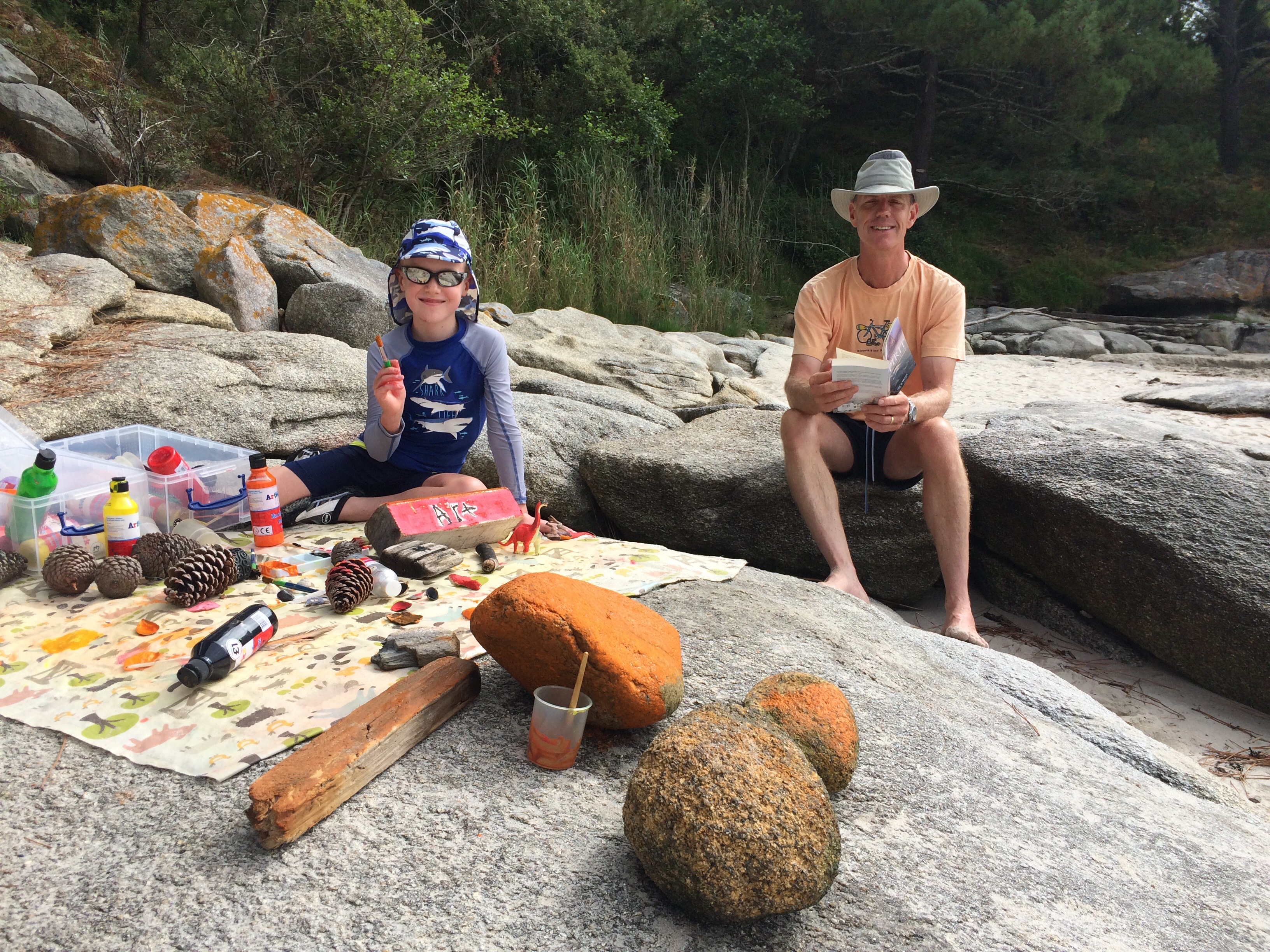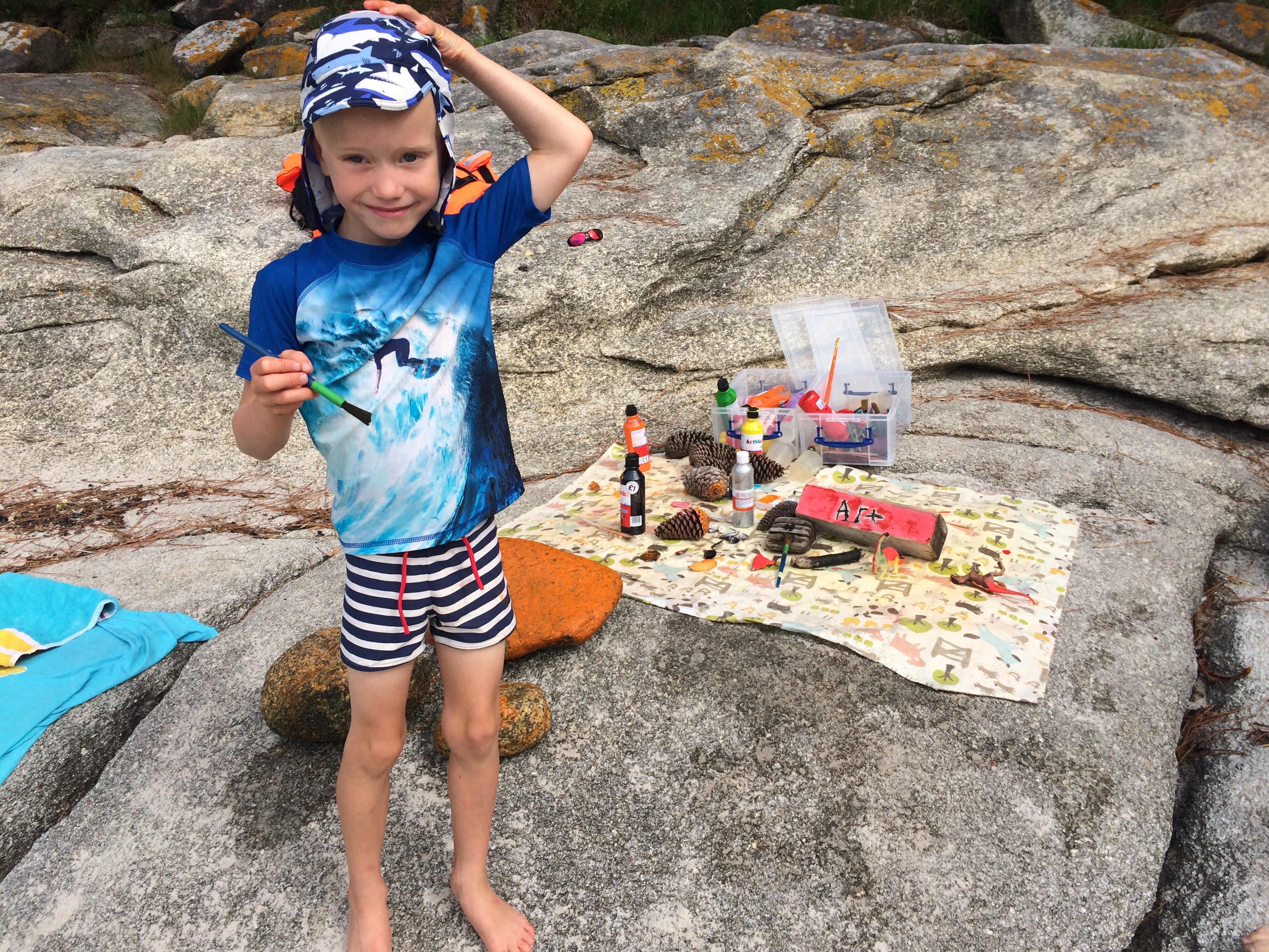 So homeschooling is tough, okay it has highs and lows. One lesson the boys have been begging for is art, specifically painting. I’m not really a mess person, let alone paint/glitter in a confined space that constantly moves! I finally relented and set up a wonderful art station on the beach. The boys were elated and merrily painted shells, driftwood, stones, pine cones and anything we could find. They were so happily absorbed in painting, I thought I might relax and read my book. Err oops, see what happened next!! Rule one of teaching learnt, remain in charge and present!!!!