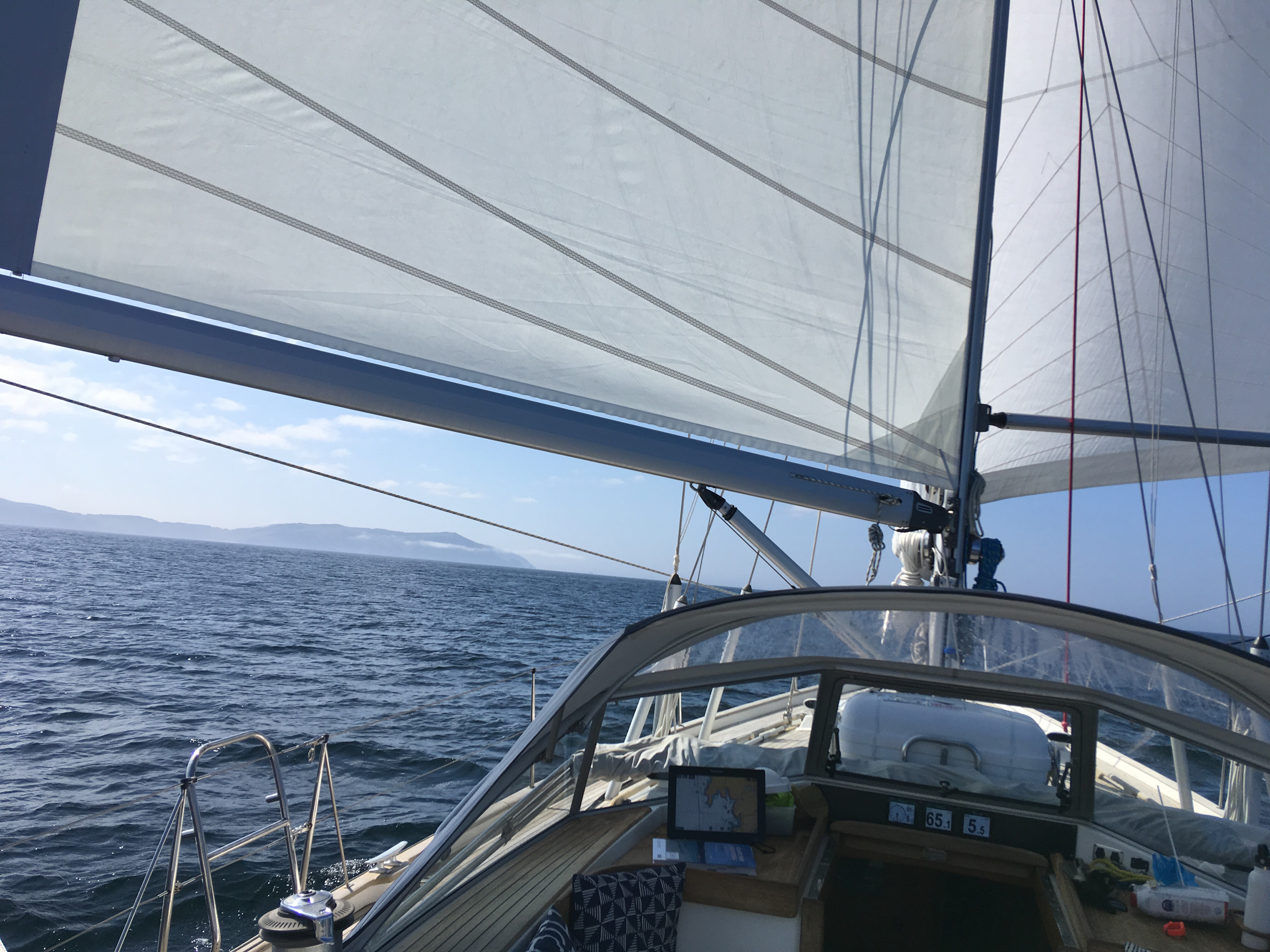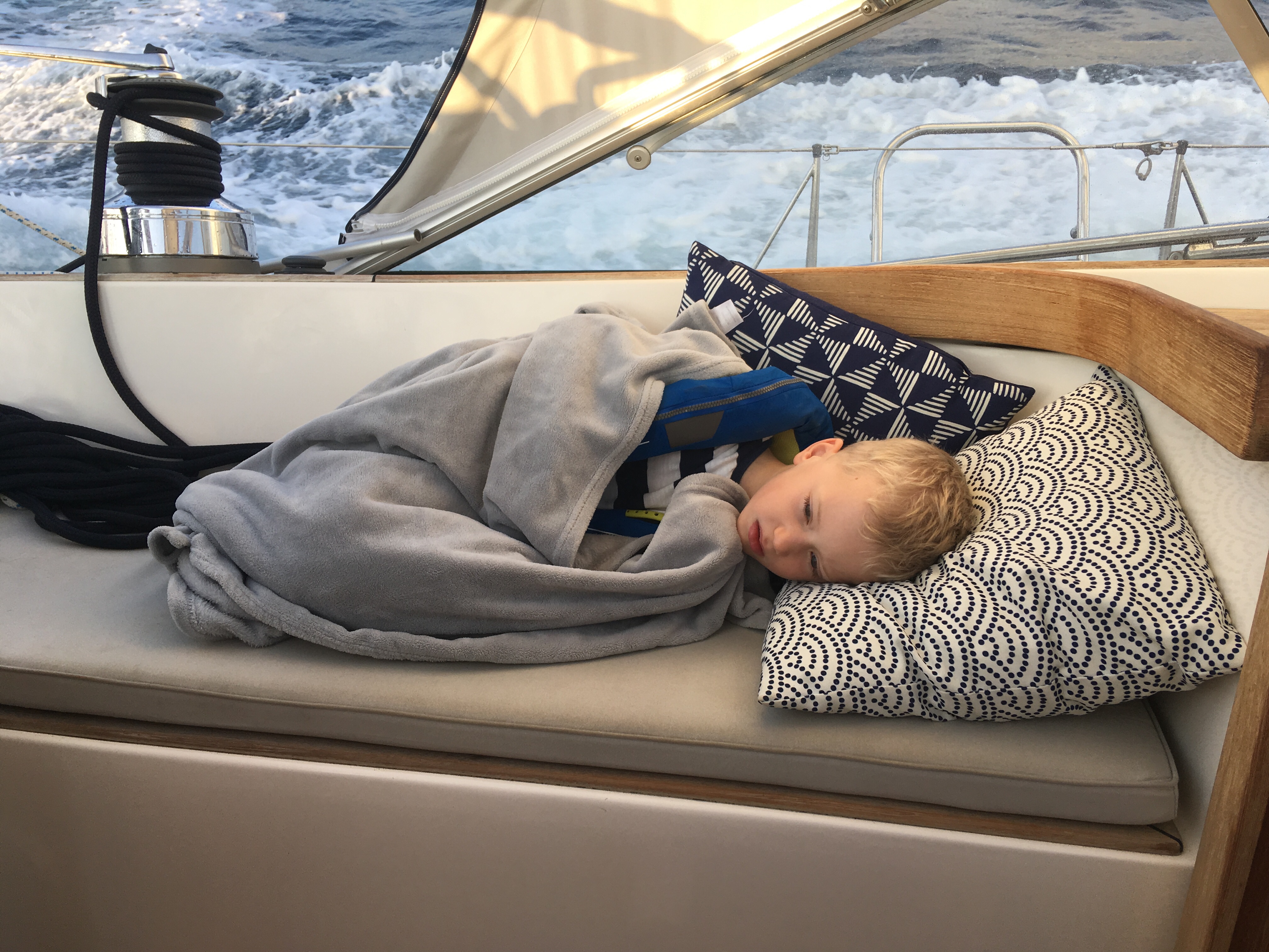 When you look at Spain the western most point jutting into the Atlantic is Cape Finisterre and one to sail with caution for tides and winds. Think of the famous surfing posters with gigantic waves, yup it’s here. So we timed it well but even so the Atlantic swell was a bit brutal and took its toll on our youngest. Felix in the seasick position, bless. Once round we were fine and had a lovely sail down wind.