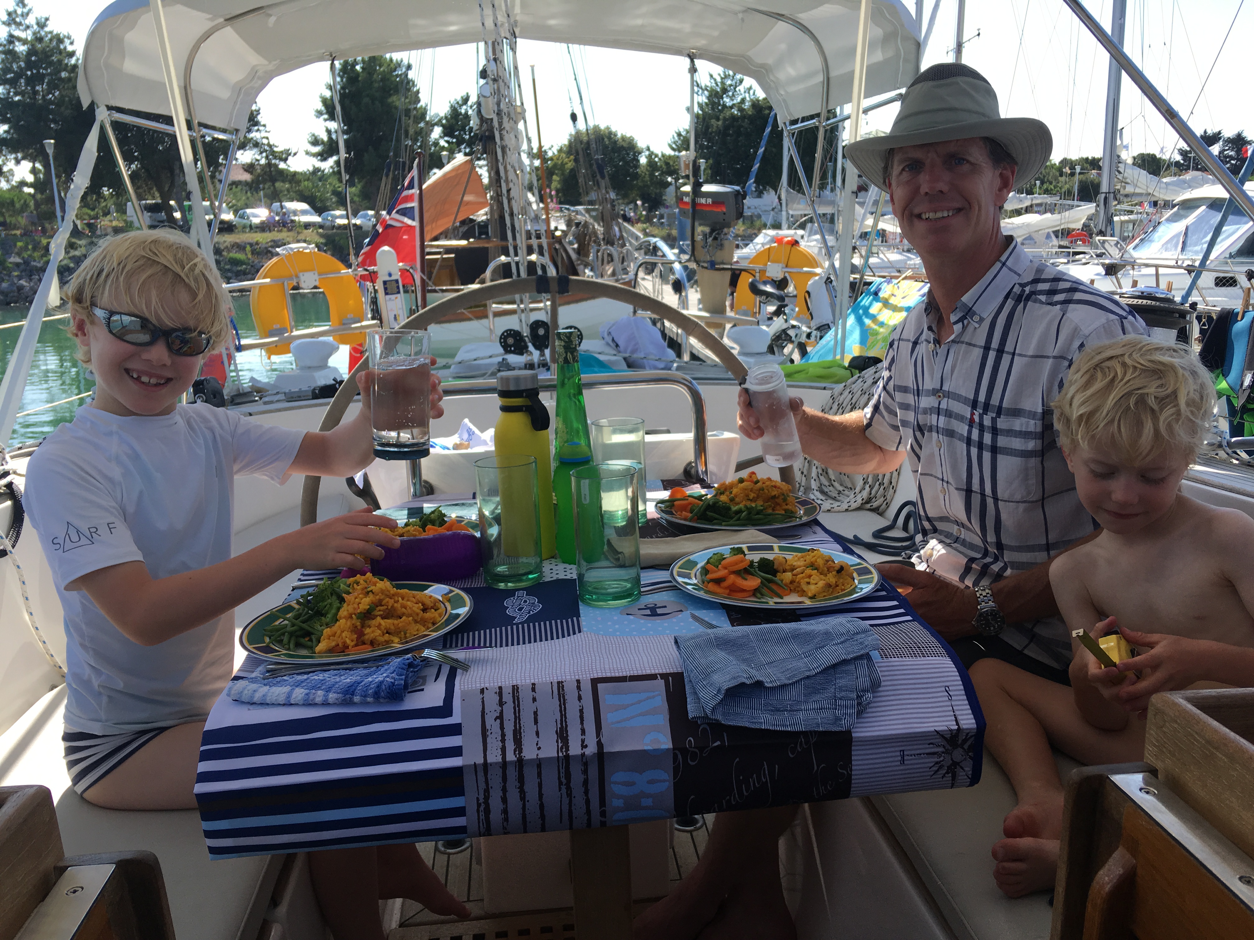 Oyster Moon safely made it too, arriving at 2am. We invited Charlie and Jess aboard for breakfast at ours leaving their exhausted parents to sleep. The children were delighted to see each other again after the trip.